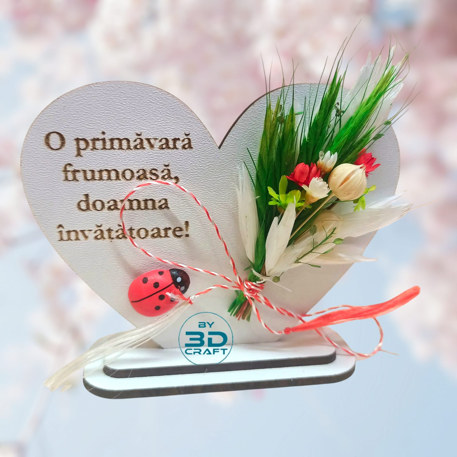 Acest mărțișor decorativ, realizat cu grijă, combină frumusețea florilor uscate cu eleganța unui mesaj gravat pe o inimă din lemn. Este accesorizat cu o buburuză decorativă și șnurul tradițional alb-roșu, simbol al primăverii și norocului. Designul său simplu și delicat îl face perfect pentru a transmite un mesaj cald persoanelor speciale din viața ta.